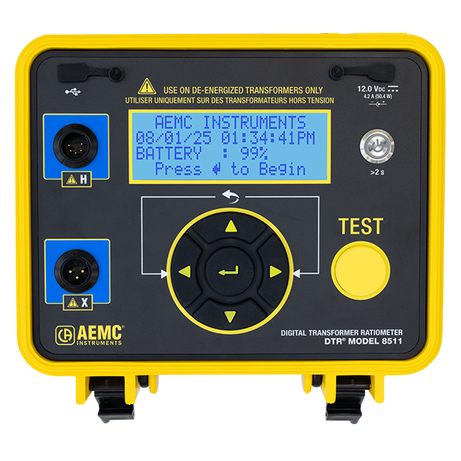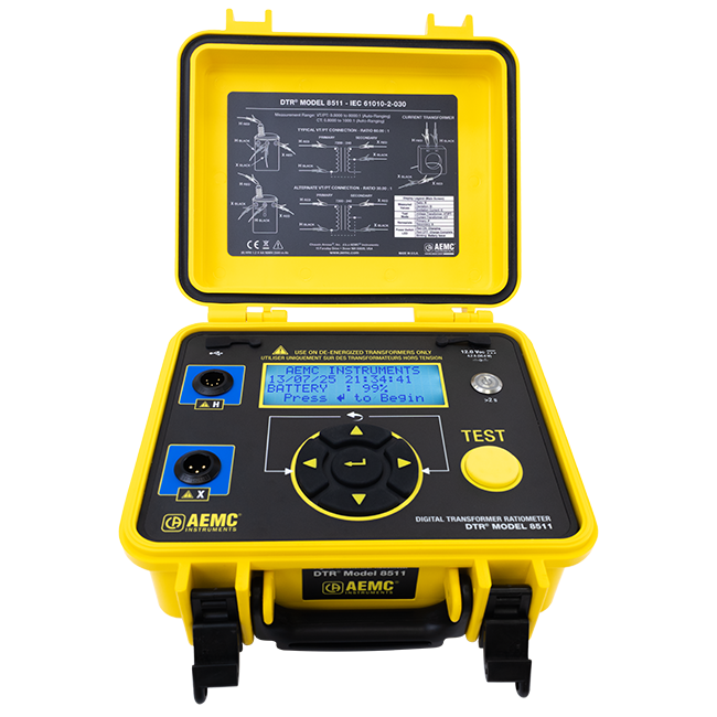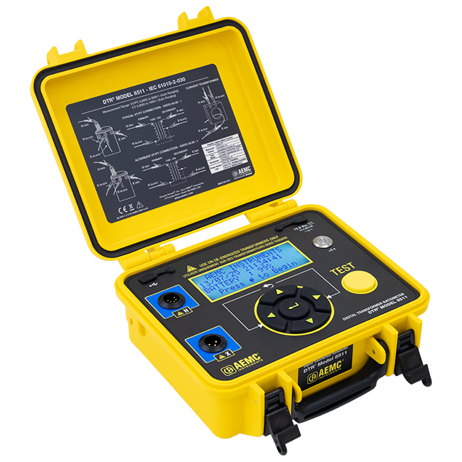 O DTR-8511 é um medidor de relação de espiras de transformador, digital e portátil, desenvolvido para medição em campo de transformadores de tensão, potência e corrente. Ao ser conectado a um transformador não–energizado, o equipamento mede com exatidão a relação de espiras, exibindo simultaneamente a polaridade e a corrente de excitação.